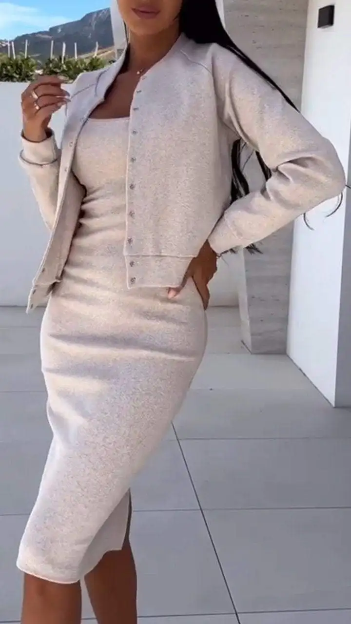 Spring Summer Sexy Slimming Suspender Dress Long-sleeved Coat Two-piece Set Women’s Gentle Style Simple Solid Color Skirt Set